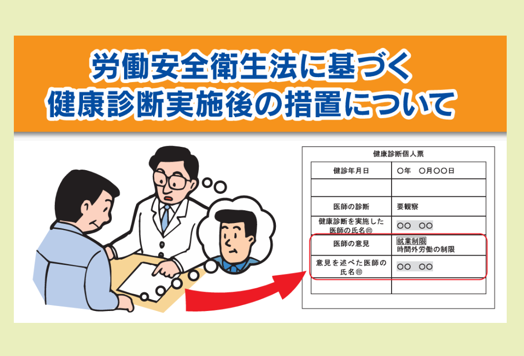 このように、異常の所見がある場合は、医師から「通常勤務」、「就業制限」、「要休業」など、就業上の措置について意見を聴かなければなりません。