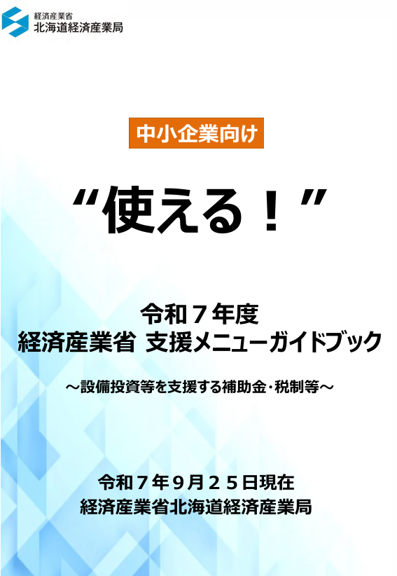 北海道経産局では中小企業の設備投資等をサポートするため、「中小企業向け“使える!”2025年度経済産業省支援メニューガイドブック」を作成しています。
