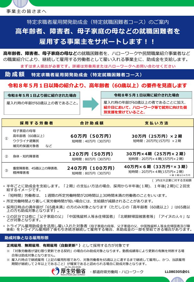 令和8年5月1日以降は、ハローワーク等において「就労に向けた個別支援を受けている」高年齢者(60歳以上)が対象労働者となります。